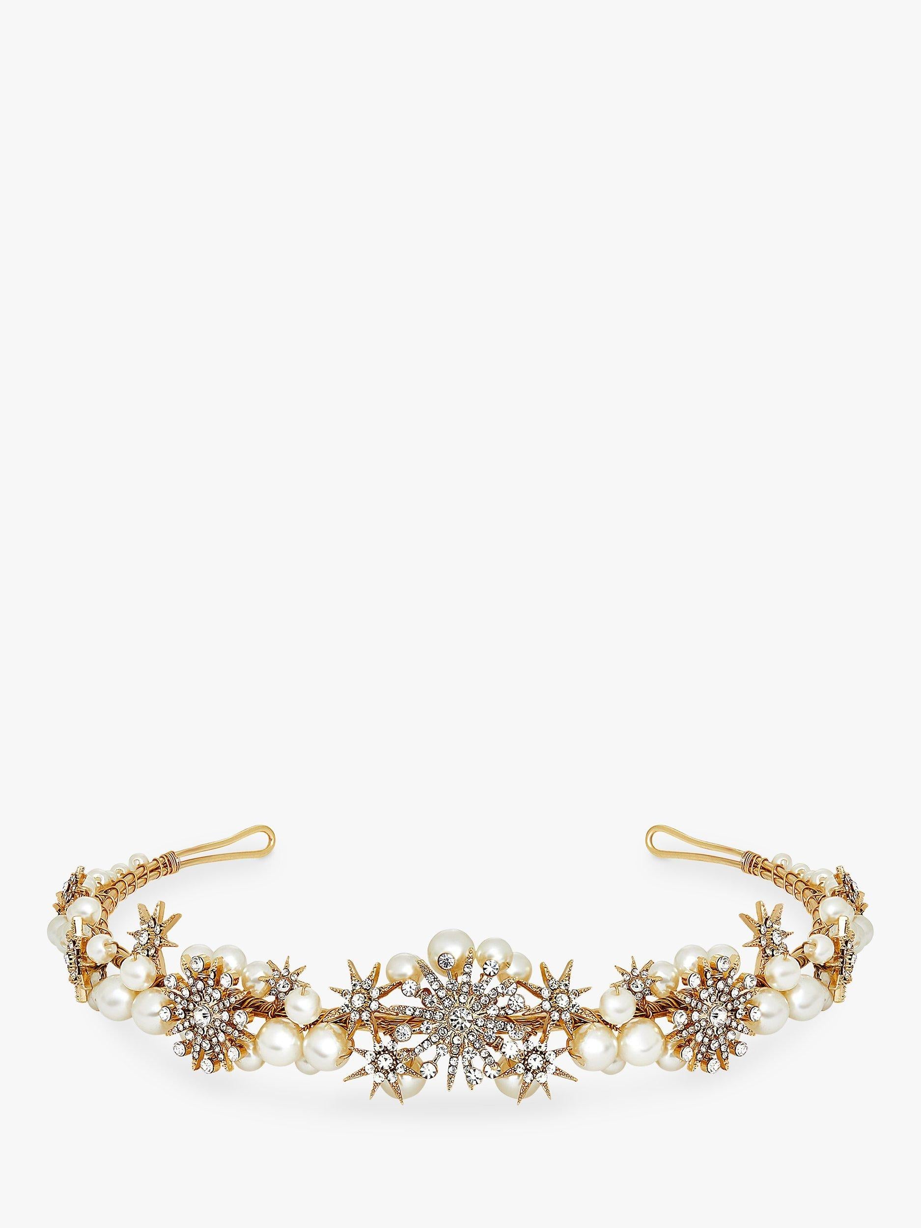 A cluster of pearls and sparkly stars on a narrow, headband-style tiara, perfect for brides-to-be who want to add an extra touch of glamour to their wedding day. Place on top of the head with a low elegant bun, or over loose curls for princess-worthy hair.