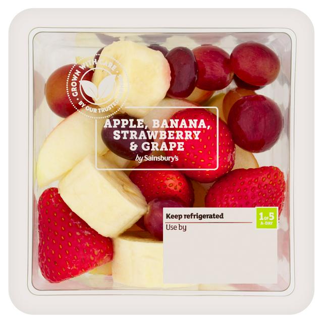 This 220g pack offers a convenient blend of four popular fruits ready for immediate consumption. The ingredients list confirms a mix of apple, banana, strawberry, and grape proportions for natural flavour. Each 100g serving provides 59 calories, keeping fat and saturates very low. This makes it a simple choice for a quick energy boost during your day.