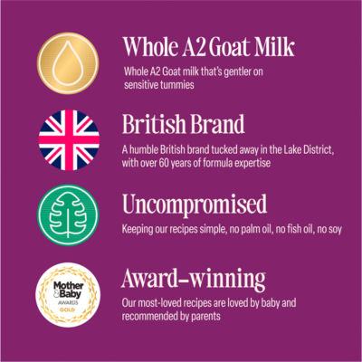 Product InformationFrom our family to yours UK Recipe Award-winning recipe, developed in the UK Family Business Our local family business puts your family first From farm to formula A2 Whole Milk We proudly use whole A2 goat milk fats No Palm Oil Kinder to your baby and our planet Goat Whey 60:40 whey: casein, as found in breastmilk Plant-Based DHA Uniquely fish-free omega-3, protecting our oceans Vegetarian The only goat formula that is veggie friendly Award-winning Queen's Award Proud winners of the Queen's award 60+ Years of science Immune system + vitamin D¹ Visual development + DHA³ MFGM‡, 3'-GL‡, 4'-GL‡, 6'GL‡ Cognitive development + iron² Physical growth + calcium4, lodine5 ‡As identified within human breastmilk, MFGM = Milk Fat Globule Membrane +Normal functioning as contributed to by the below referenced ingredients. ¹Vitamin D contributes to the normal function of the immune system in children, ²Iron contributes to normal cognitive development of children, ³DHA contributes to the normal visual development of infants up to 12 months of age. Benefit from daily intake of 100mg of DHA, ⁴Calcium is needed for normal growth and development of bone in children, ⁵lodine contributes to the normal growth of children.