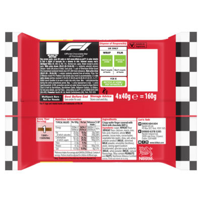 FeaturesA delicious chocolate bar, comprising a crispy wafer covered with a tasty layer of milk chocolate. Multipack of 4 chocolate bars. A great treat when you're enjoying a break, a KITKAT with a bit more bite. No artificial colours, flavours or preservatives. Suitable for vegetarians.
