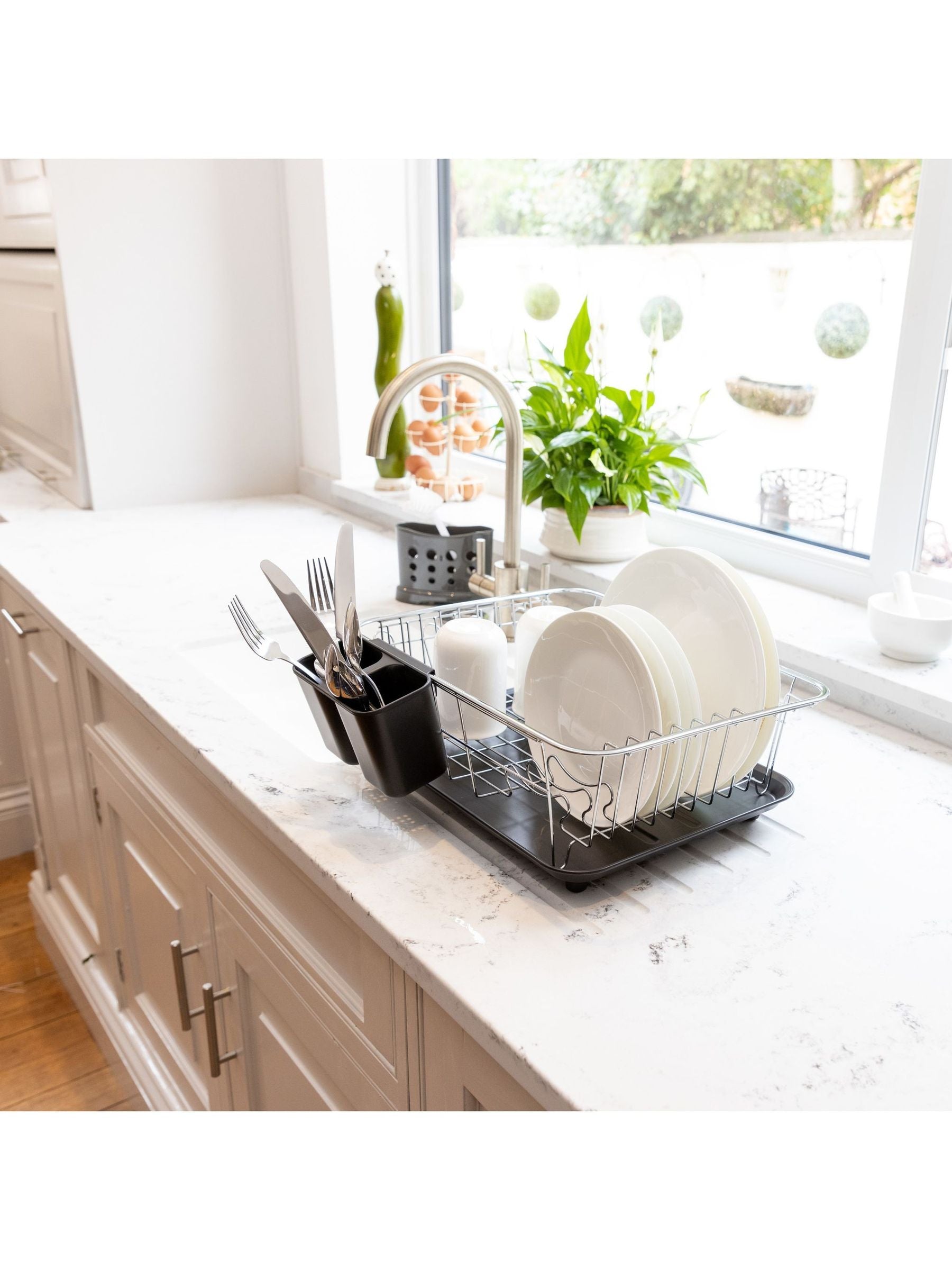 Raised feet and drip tray help dishes dry quickly and hygienically. Draining spout directs water back to the bowl to prevent pooling, odours and rust. Generous size lets you dry up to 9 plates and several mugs, as well as cutlery with the removable holder. Chromed steel design is robust, rust-resistant and looks great on any countertop. Includes a 12-month KitchenCraft guarantee for your peace of mind. This family-sized washing-up drainer holds lots of crockery and is designed to dry it quickly and hygienically. That's thanks to its raised feet and built-in drip tray, which allow plates and mugs to drip dry while ensuring a steady airflow. There's a built-in drainage spout, too. Simply point it towards your washing-up bowl and it will prevent pooling and odours while helping to keep your draining board free from rust. Made of robust stainless steel with a chrome finish that suits any kitchen décor. Easy to wipe clean. Dimensions: 42 x 30 x 15.5cm.