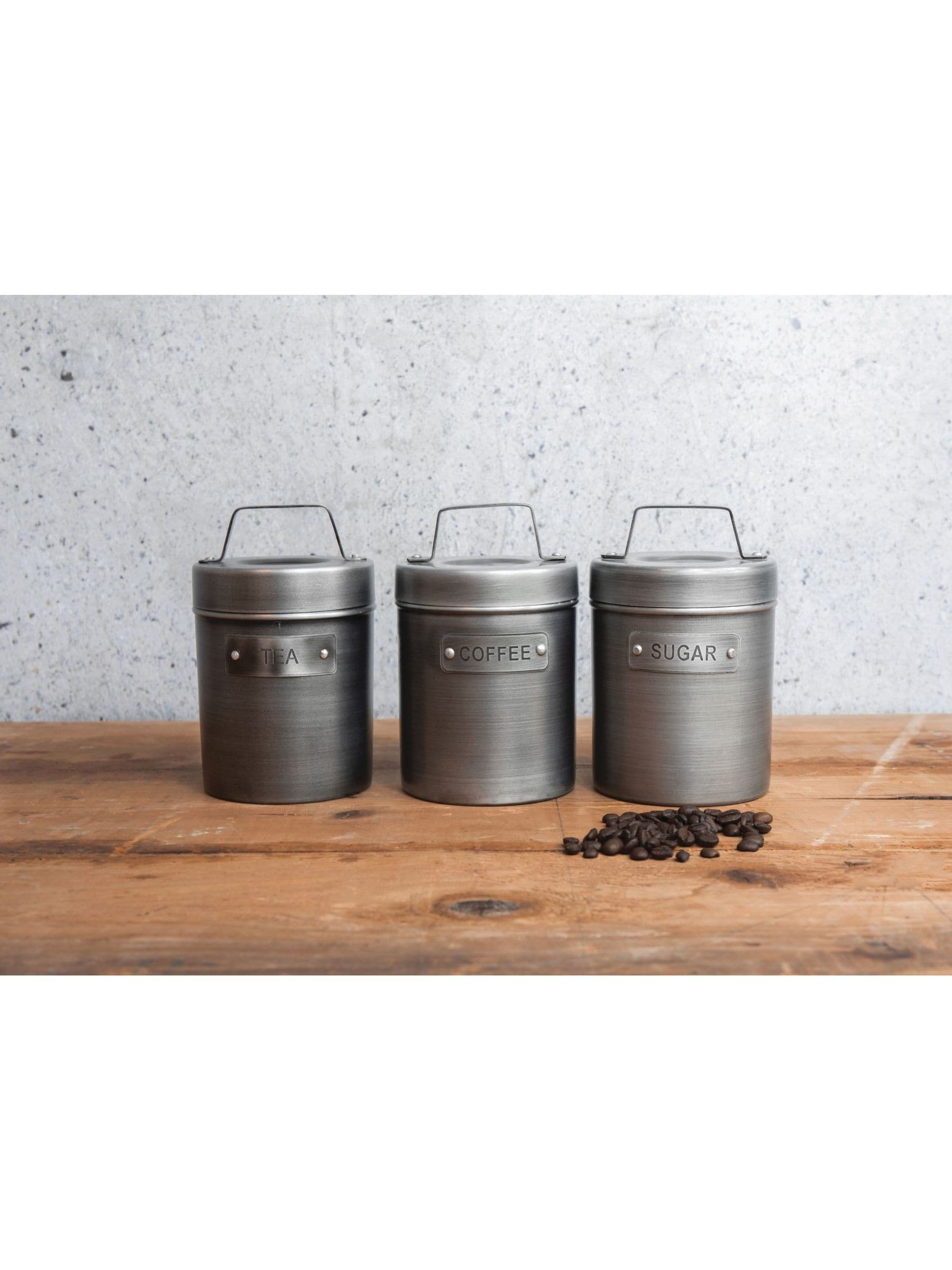 Stay organised with this set of 3 labelled canisters for tea, coffee and sugar. Raw brushed-metal design brings the modern industrial look to your kitchen. Tight-fitting lids keep freshness locked in for long-lasting flavour. Small footprint – show them off on a shelf or stash them neatly in a corner. Packaged in an attractive KitchenCraft box with a 12-month guarantee. Nail the industrial look and make your kitchen feel like a trendy Berlin coffee bar with the KitchenCraft Industrial Kitchen collection. These metal tea, coffee and sugar canisters are a great way to get started. With their brushed finish and riveted handles, they look raw, elegant and uncompromisingly on-trend. Perch them on a shelf or display them proudly on your counter. They'll keep your tea and coffee-making essentials tasting fresh and your kitchen looking even fresher. Each has a handy metal label so you always know which is which. Capacity (each): 1 litre.