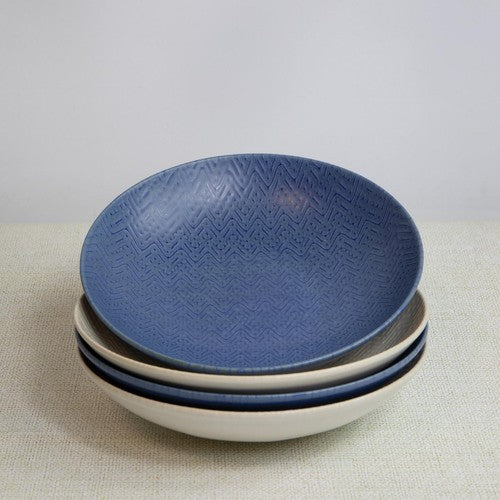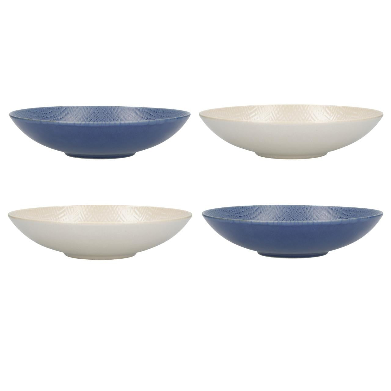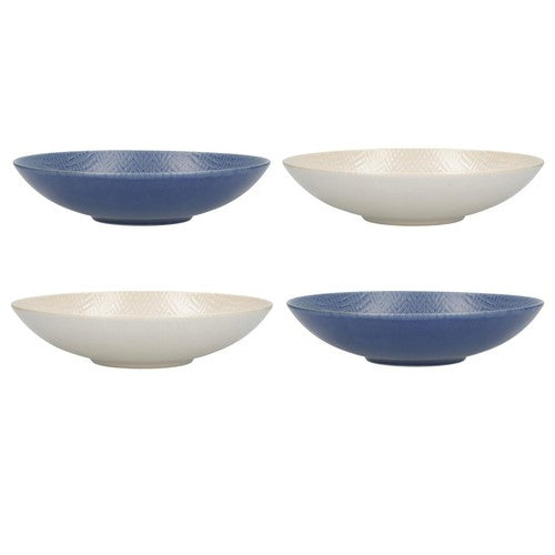 This KitchenCraft stoneware coupe bowl set includes four pieces finished in a stylish blue and cream design. These durable 22cm bowls feature an attractive embossed detailing around the rim for added texture and visual interest. They are designed for versatile daily use, easily accommodating soups, salads, or pasta dishes. As part of a coordinated dining collection, this set offers both function and aesthetic appeal for your table setting.