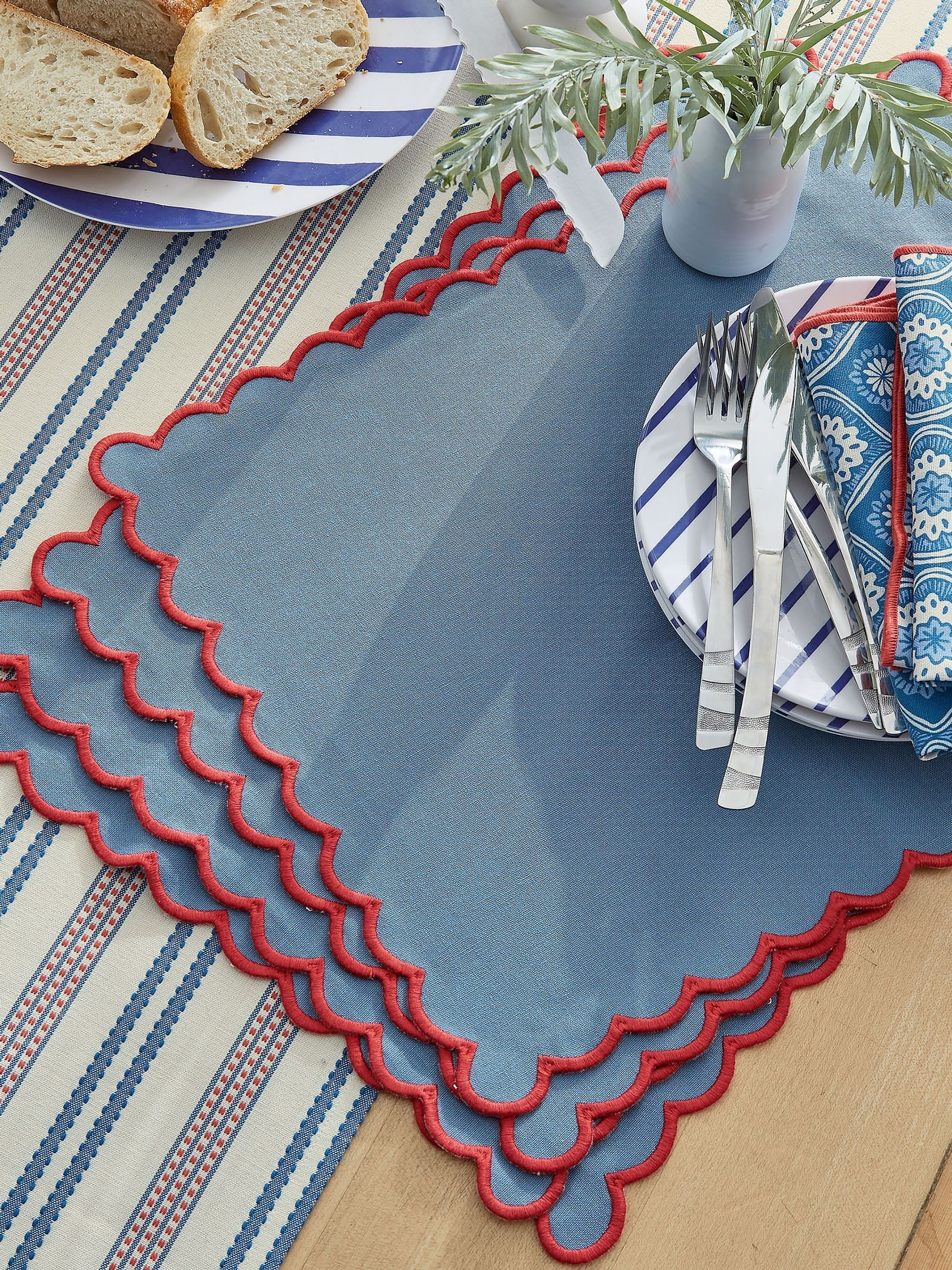 Plain blue placemat pair with a scalloped edge all round trimmed with red.