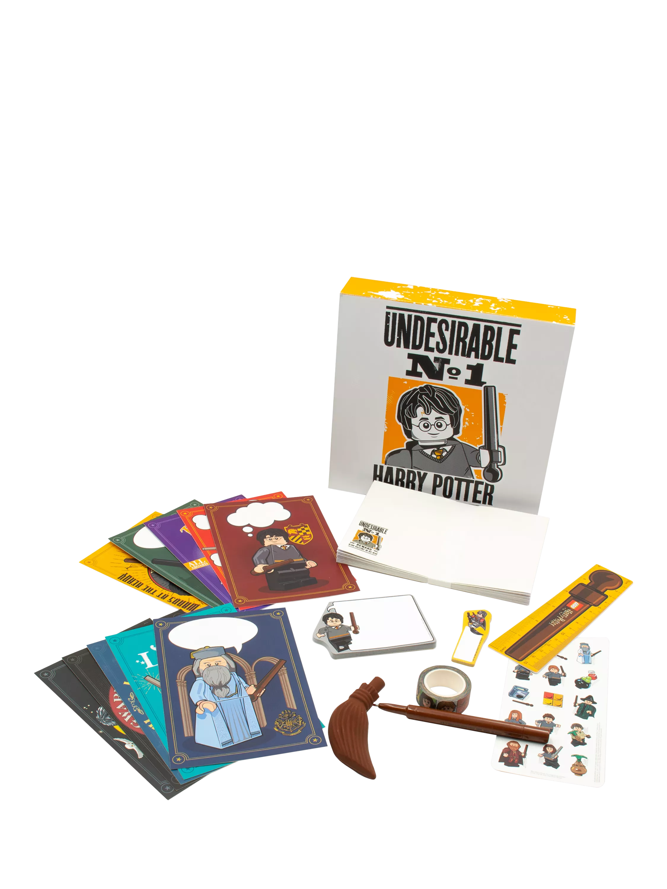 Enjoy writing with the LEGO® Harry Potter™ Pen Pal Stationery Gift Box, featuring an array of stationery to get started with right away. This set is complete with a Harry Potter™ inspired Broomstick gel pen, envelopes, postcards, sticker sheet, Harry Potter™ character tape, sticky notes, page markers and bookmark/ruler.