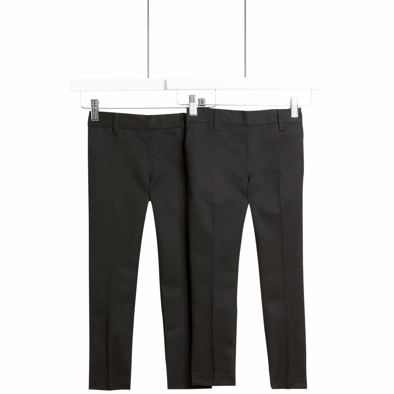 These M&S boys' trousers offer a modern, skinny-leg fit suitable for school wear. They are conveniently supplied as a handy two-pack for busy parents. The construction includes an adjustable waist and hems, allowing for comfort and accommodating growth across the school year.
