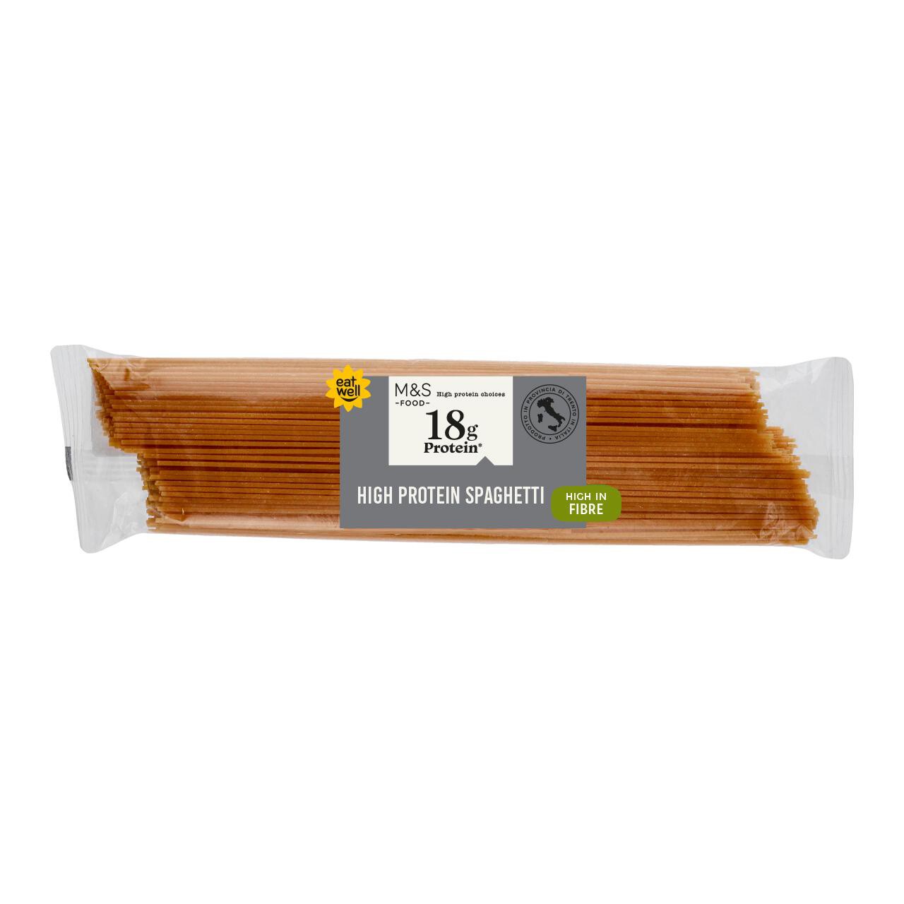 M&S High Protein SpaghettiHigh protein spaghetti made with a blend of yellow split pea flour and durum wheat semolina. High in fibre. 18g protein per 80g serving of dry pasta. Suitable for vegans.