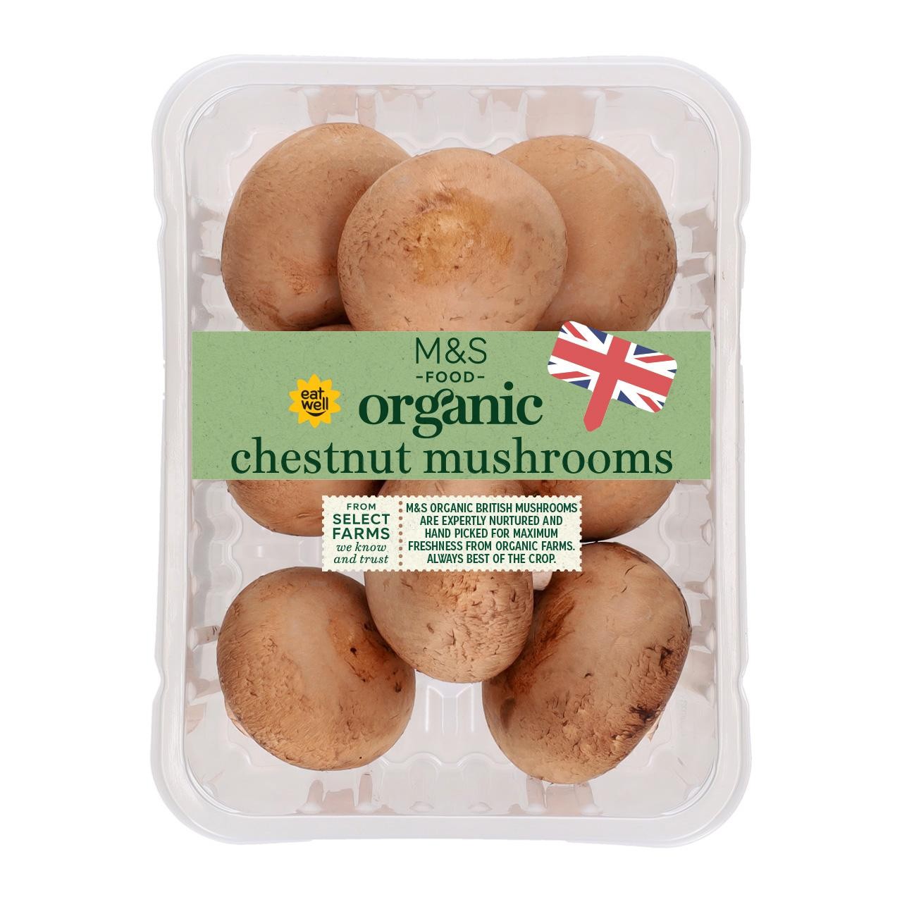M&S Organic Chestnut Mushrooms Organic chestnut mushrooms, grown with care to certified standards. Wash before use and sauté or grill for five minutes or until just tender. Perfect for adding to stroganoff, pasta, sauces and salads.