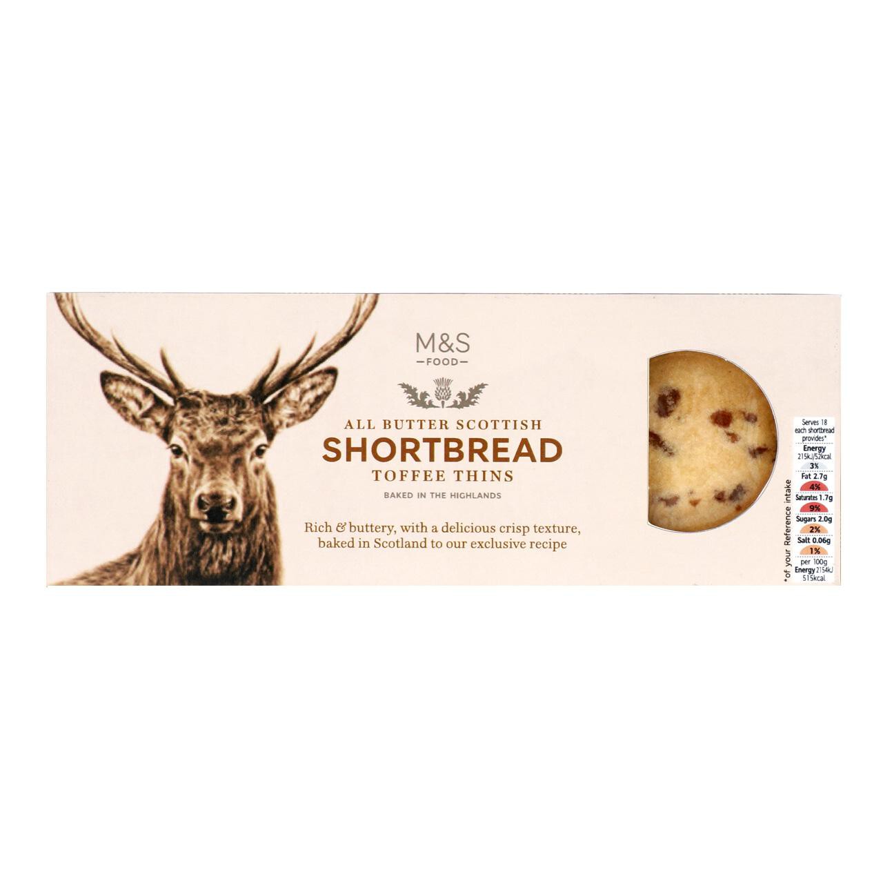 M&S Scottish All Butter Toffee Shortbread ThinsRich and buttery all butter shortbread toffee thins, with a delicious crisp texture. Baked in Scotland to our exclusive recipe, they're best enjoyed with a cup of tea.