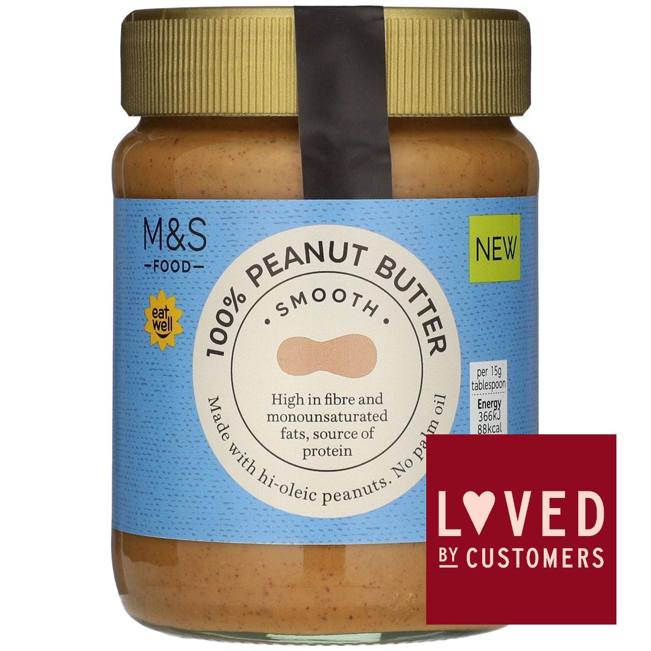 M&S Smooth Peanut ButterMade with hi-oleic peanuts, this 100% smooth peanut butter is high in fibre and monounsaturated fats and uses no palm oil. Source of protein. Suitable for vegans. Making healthy choices couldnât be easier or tastier with our Eat Well range.