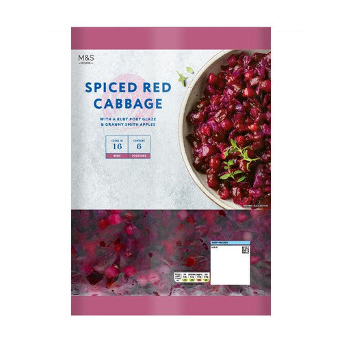 This M&S Food Spiced Red Cabbage is a sophisticated frozen preparation ready for easy serving. It features tender shredded red cabbage combined with sweet and tart fruit elements. The dish is carefully simmered with onions, Granny Smith apples, redcurrant, and cranberries for depth. This flavour combination is then finished beautifully in a rich ruby port glaze, offering a ready-made accompaniment.