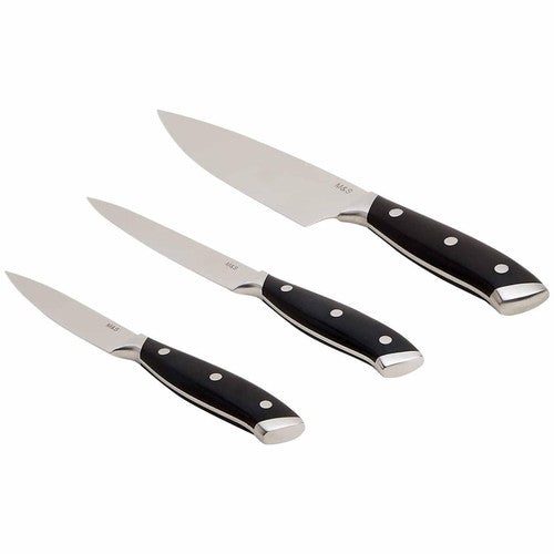 This essential Marks & Spencer set features three versatile stainless steel knives designed for comprehensive daily food preparation. The tools combine polished, durable blades with traditional black handles, securely fastened using three visible silver rivets. This robust construction method ensures reliable performance and a comfortable grip for various culinary requirements.