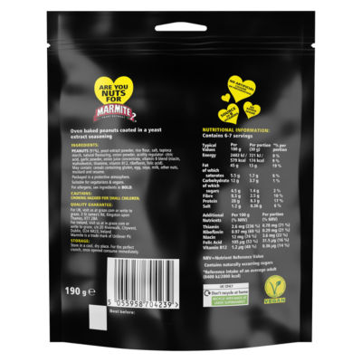 FeaturesTasty Peanuts Baked with Lots of Lovely Marmite Seasoning. Source of Protein and B Vitamins. High in Fibre. No Added Sugar - Contains naturally occurring sugars. No Artificial Colours or Preservatives. Suitable for Vegans. European Vegetarian Union.