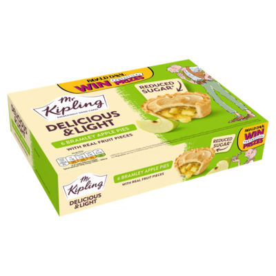 Product InformationMr Kipling's Deliciously Good Bramley apple pie recipe is made using a scrumptious melt-in-the-mouth shortcrust pastry, bursting with chunks of apple and a sprinkling of sugar for that delightful finishing touch. Made with real fruit, you can now enjoy with 30% less sugar! These lovely apple pies can be eaten cold or heated up and enjoyed with a pot of team. Why not enjoy them as an afternoon snack, pop them into your lunchbox or as a heart warming dessert after a meal? It's the little things that mean the most, like an exceedingly good cake from Mr Kipling. Exceedingly good, surprisingly healthier.