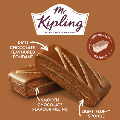 FeaturesMr Kipling Chocolate Slices. Chocolate sandwich cake with chocolate-flavour filling. Lovingly Baked in Britian. Suitable for vegetarians. Sharing-ready pack of eight.