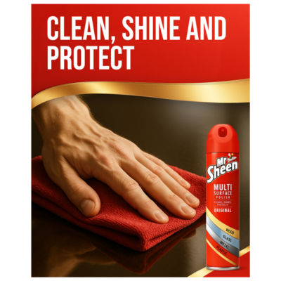FeaturesCleans, Shines & Protects. For use on Wood, Glass, Metal & Plastic.. Mr Sheen with dust trap technology picks up x2 more dust than using a dry paper towel alone..