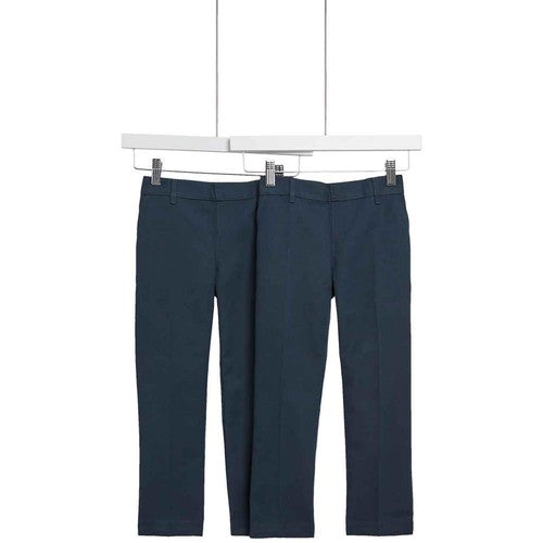 These navy boys' school trousers arrive in a convenient two-pack, ideal for the busy school week. They are constructed from crease-resistant fabric designed to maintain a smart appearance all day long. The regular fit cut ensures comfort for active pupils needing reliable daily wear.