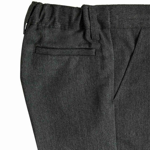 These boys' grey trousers are designed with a modern slim-leg fit for a sharp appearance. They are constructed using a new, improved fabric that offers practical protection for daily school use. The material incorporates technology to resist creases, ensuring a neat look throughout the day.