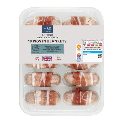 Enjoy these MS Select Farms Collection British outdoor bred pigs in blankets for your next meal. These cocktail-sized portions use pork sourced entirely from British farms. They offer a convenient and high-quality addition to any plate.