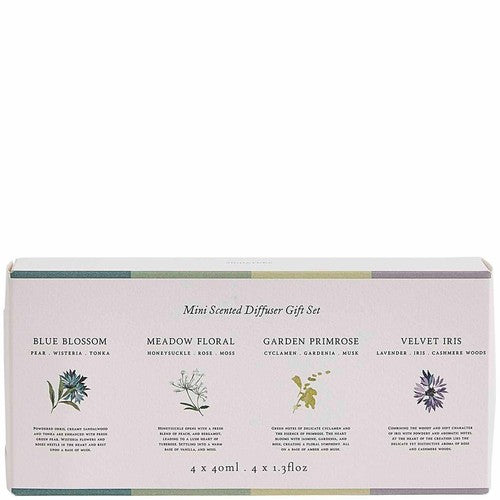 Read MoreGive the gift of beautiful home fragrance with this set of four diffusers from M&S' Signature collection. A celebration of fresh florals and botanicals, it showcases M&S' Blue Blossom, Velvet Iris, Garden Primrose and Meadow Floral scents in four mini glass bottles. Light-coloured reeds complete the stylish look.