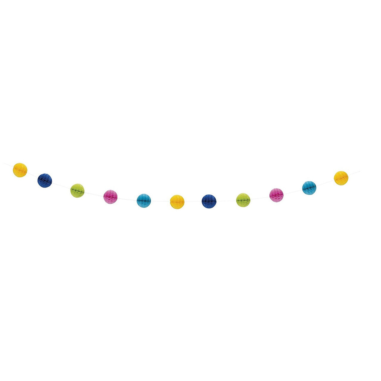 Throw an engagement party full of elegant charm with this festive multicolour Honeycomb Ball Garland. Featuring majestic tissue paper balls, this paper garland is also an ideal decoration for a birthday party, 25th wedding anniversary, New Year's Eve party, wedding or holiday party. Drape this paper decoration across display tables, attach to walls or archways, or hang above a party table to add eye-catching colour to the celebration. For even more impact, combine it with other hanging tissue paper decorations to create a stunning floating ceiling effect or impressive display wall. Each of the individual paper honeycombs includes a small adhesive strip in the centre so that they can be easily unfolded.Size: 7ft (2.13m) with 11 honeycomb balls each measuring 8cm (3")