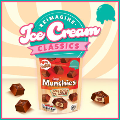 Product InformationDiscover the new MUNCHIES® Cookie Dough Ice Cream sharing bag, smooth milk chocolate cubes encasing a delicious cookie dough flavour filling & crunchy biscuit centre, making them the ideal treat to share with family and friends. Part of the Nestle® Ice Cream Collection - Look out for Aero® Neapolitan Melts and Milkybar® Rasberry Ripple Buttons out now! MUNCHIES® were originally created by Mackintosh's and initially produced in the factory in Norwich. They were launched into the UK market in 1957. The product has since launch been an individual milk chocolate cuboid shell filled with a sweet, buttery, soft caramel and a crisp biscuit piece. Over the years there have been a number of different flavour variants launched under the MUNCHIES® brand including Chocolate Orange in 1977 and Banoffee in 1996 however the original has remained consistently the favourite flavour within the range. In addition to the 52g tube and 104g sharing bag which can be found in retailers all year around, the MUNCHIES® range also includes Easter Eggs and Christmas giant tubes.