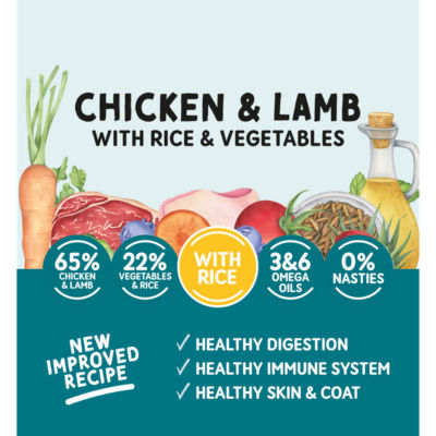 FeaturesOur Promise - 100% Natural Ingredients with Added Vitamins and Minerals. 65% Chicken & Lamb. 22% Vegetables & Rice. With Rice. 3&6 Omega Oils. 0% Nasties. Healthy Digestion. Healthy Immune System. Healthy Skin & Coat. Complete & Balanced.