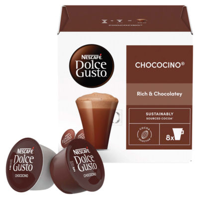 Product InformationPremium Chocolate Meets Frothy Whole Milk Discover the indulgent-tasting NESCAFÉ® Dolce Gusto® Chococino. This isn't just a regular hot chocolate, this is an intense chocolate taste with notes of vanilla, rounded off with a deliciously dense and chocolaty froth. The combination of high quality chocolate and whole milk and the unique creamy texture ensure every mug of NESCAFÉ® Dolce Gusto® Chococino is a real chocolatey treat. The box contains 16 capsules (8 chocolate capsules and 8 milk capsules) designed for NESCAFÉ® Dolce Gusto® capsule coffee machines for you to prepare 8 mugs of Chococino.