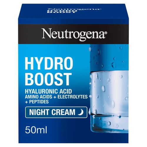 Read MoreWake up to fresh, hydrated skin after just one use with Neutrogena® Hydro Boost Night Cream. This oil-free, non-sticky, overnight moisturiser has been developed with dermatologists and enriched with hyaluronic acid and NMF, for 9x more hydration* and an 80% stronger skin barrier. This overnight cream with NMF (Natural Moisturising Factor) contains a group of moisturising ingredients that are found in your skin and help maintain skin hydration. The Hydro Boost Night Cream NMF complex contains 20% more Hyaluronic Acid**, helping to retain water and boost hydration; Amino Acids, known to support and strengthen the skin barrier; Electrolytes, known to boost ingredient absorption; and Peptides, known to improve skin suppleness. The cream acts as a protective layer over the skin to help prevent moisture loss. Skin is intensely hydrated with a supple, dewy glow that lasts all day long, leaving you with rested and revitalised skin that stays hydrated for 24 hours. *vs untreated control **vs previous formula