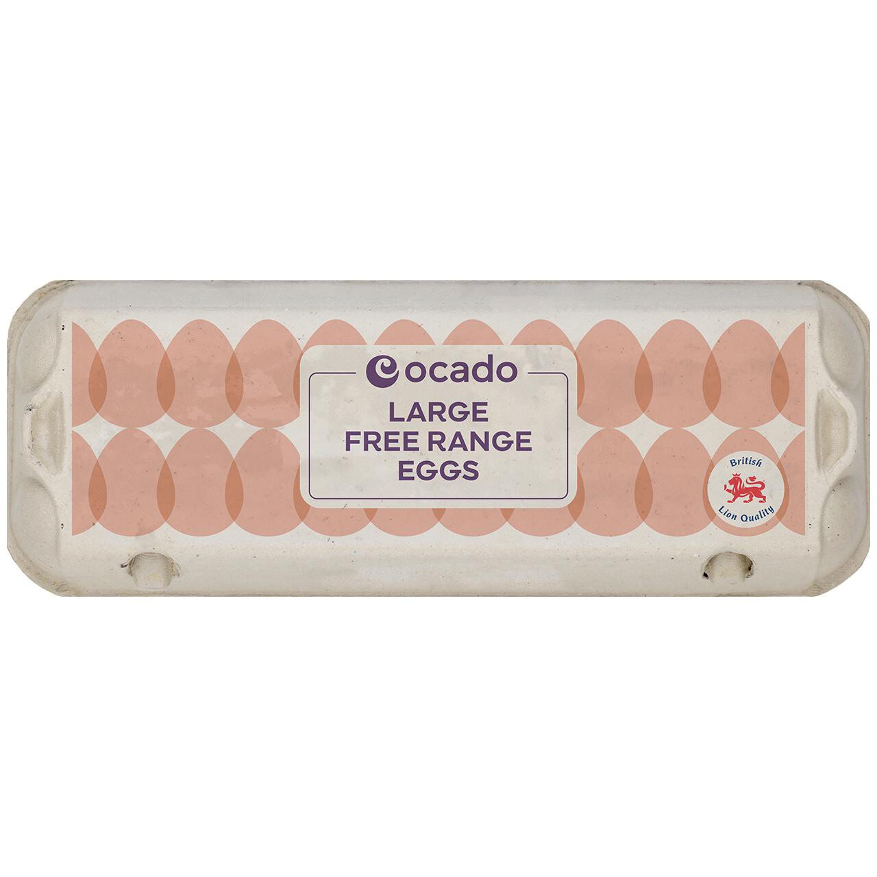 Ocado 12 Large Free Range Eggs.Class A.Eggs are a fantastic fridge staple because they taste great on their own, or work well as an ingredient in lots of dishes. Whether they're boiled or baked, poached or fried, they are a perfect addition to a light lunch or a main meal. You can also create some brilliant bakes by whisking, folding and beating into cakes and cookies, flans, tarts and quiches. Suitable for vegetarians.If you're looking for boxes big or small, search 'Ocado eggs' for our full range of free range and organic eggs. Ocado free range eggs have been laid on farms by hens that have the freedom to roam outdoors during the day. They have been produced to high welfare and environmental standards and the hens enjoy a cereal based vegetarian diet.What does the Lion mark mean for you?The Lion mark is your guarantee that these are quality eggs laid by British hens vaccinated against Salmonella. More information and hundreds of recipe ideas at egginfo.co.uk.What does the RSPCA logo mean for you?The free range eggs in this pack come from producers inspected to RSPCA welfare standards by the RSPCA's independently certified farm assurance scheme.