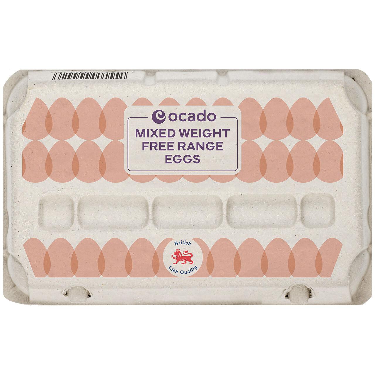 Ocado 15 Mixed Weight Free Range Eggs (minimum of 720g).Eggs are a fantastic fridge staple because they taste great on their own, or work well as an ingredient in lots of dishes. Whether they're boiled or baked, poached or fried, they are a perfect addition to a light lunch or a main meal. You can also create some brilliant bakes by whisking, folding and beating into cakes and cookies, flans, tarts and quiches.If you're looking for boxes big or small, search 'Ocado eggs' for our full range of free range and organic eggs. Ocado free range eggs have been laid on farms by hens that have the freedom to roam outdoors during the day. They have been produced to high welfare standards and the hens enjoy a cereal based vegetarian diet.