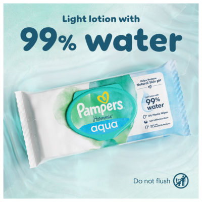 Product InformationGentle care and protection for your baby's precious skin - delicate lotion with 99% water. Pampers Harmonie Aqua baby wipes are gentler than just cotton wool & water. Thanks to their unique formula, gentle skin cleansers and protectors help restore natural skin pH, protecting against irritation. They are made with 0% alcohol or perfume. The formula is dermatologically tested. It is approved by Skin Health Alliance dermatologists and certified according to Standard 100 by OEKO-TEX. Remember to bin your wipes and not to flush them.