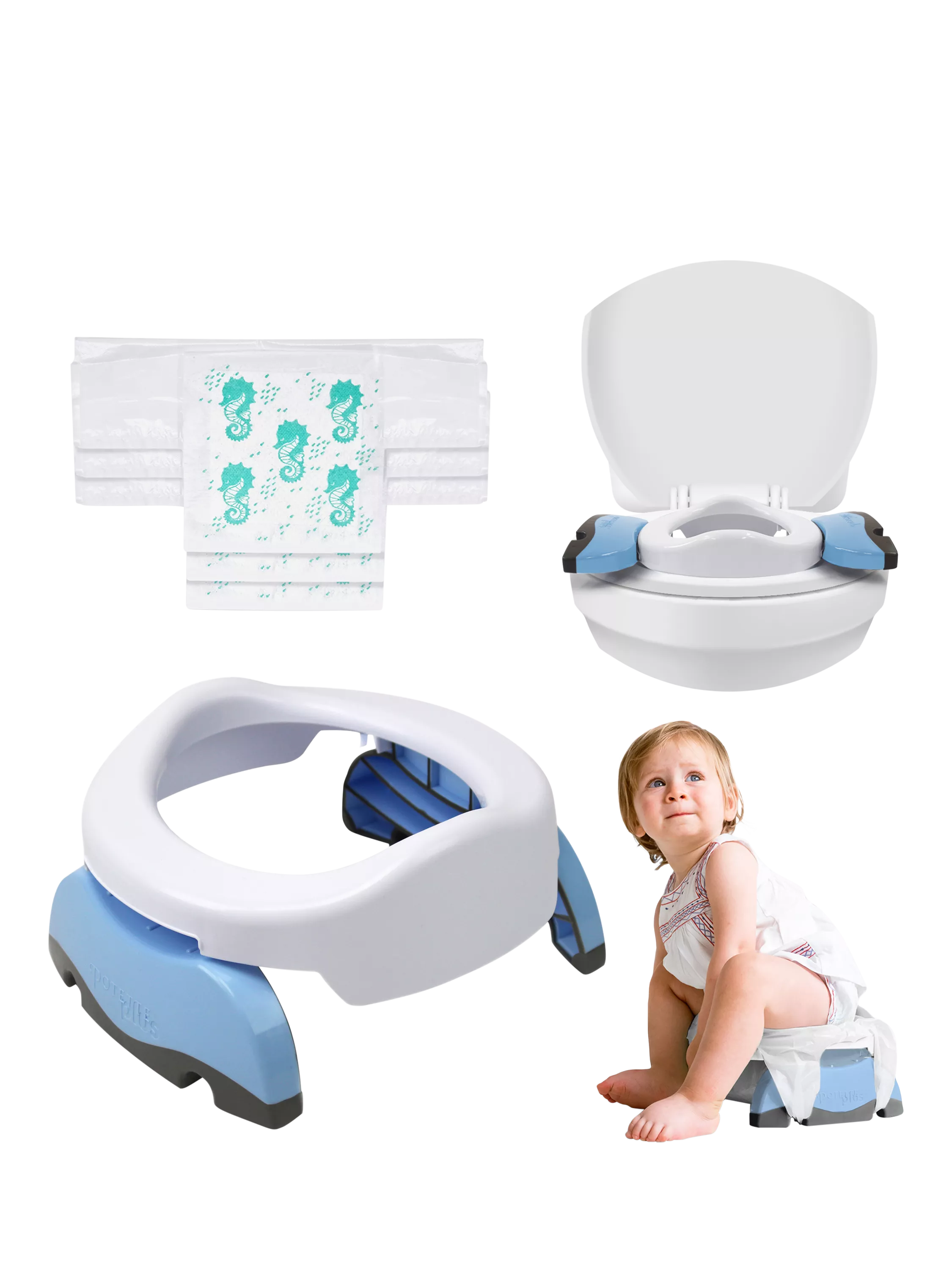 This full size travel potty has 3 absorbent liners and rubber feet to prevent it from sliding around. It turns into a folding toilet trainer seat, and has a hygienic travel bag to store it in.