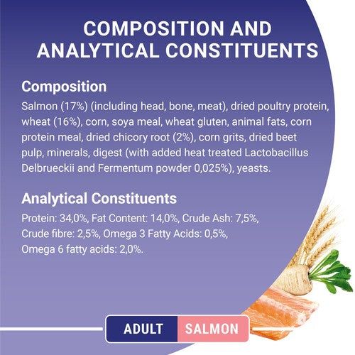 Salmon (17%) (including Head, Bone, Meat), Dried Poultry Protein, Wheat (16%), Corn, Soya Meal, Wheat Gluten, Animal Fats, Corn Protein Meal, Dried Chicory Root (2%), Corn Grits, Dried Beet Pulp, Minerals, Digest (with Added Heat Treated Lactobacillus Delbrueckii and Fermentum Powder 0.025%), Yeasts