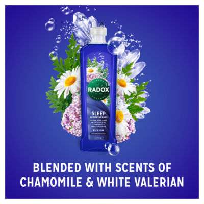 Product InformationEnjoy the unique, soothing blend of herbs, minerals, chamomile and white valerian scent with RADOX Sleep Aromatherapy Bath Soak. From troubles to bubbles, close your eyes and let the calming bath soak cleanse your body, de-stress and revive you. RADOX Sleep Aromatherapy Bath Soak is enriched with 4 minerals and RADOX's unique blend of 13 herbs that helps you indulge in a soothing bath therapy ritual. Blended with our DreamScentz fragrance, it improves the quality of sleep. Our blends, uniquely created with minerals and herbs, activate with hot water to cleanse and revive you in a soothing bubble bath. For best results, pour bath gel under running water and relax. For lots of bubbles, pour a generous amount of RADOX Sleep Aromatherapy Bath Soak into an empty bath, and run the tap over the top whilst stirring with your hand. Avoid contact with eyes. If eye contact occurs, rinse well with warm water. If rash or irritation occurs, discontinue use. From as early as 1908, RADOX founders used a unique blend of minerals and herbs to ease the fatigue of weary bodies and minds. From reviving the tired feet of early travellers to helping hardworking people find a moment of solitude and sanctuary – RADOX bath soaks and bath salts are rooted in the transformative power of mineral therapy. We have a long history of everyday therapy, we call it your daily R&R, RADOX Mineral Therapy. Enjoy our Sleep Aromatherapy Bath Soak.
