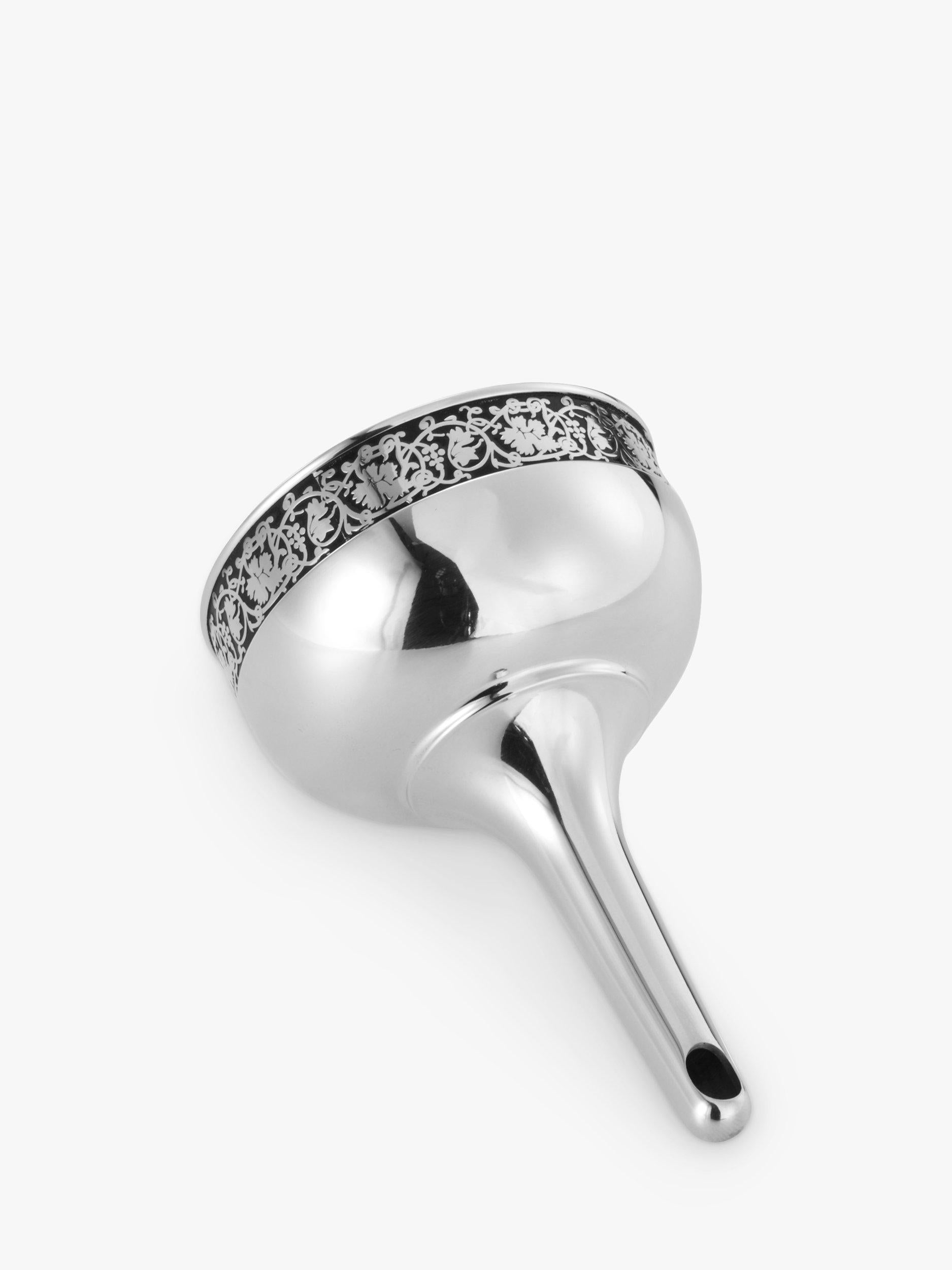 This Royal Selangor Wine Funnel elevates your serving experience significantly. Crafted from fine Pewter, it showcases the intricate William Morris grapes and vine motif elegantly around the rim. It ensures perfectly aerated wine is poured smoothly every time. The included sieve removes unwanted sediment before it reaches your clean glass.