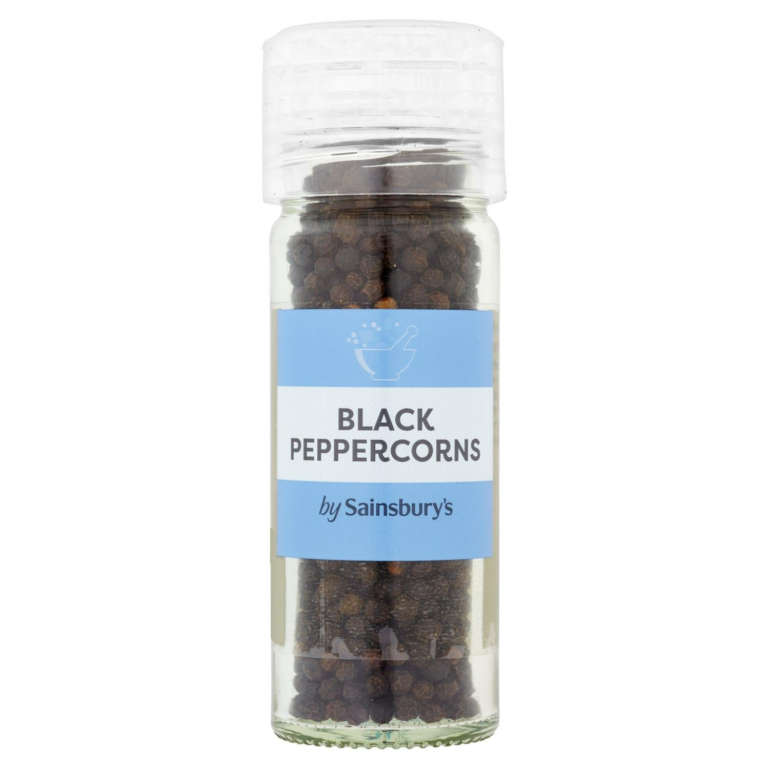 This Sainsbury's Black Peppercorn Grinder provides freshly ground seasoning conveniently for your kitchen. It contains whole black peppercorns sealed within a clear glass jar for optimal visibility and freshness retention. This product is designed to deliver sharp, aromatic flavour directly onto your meals.