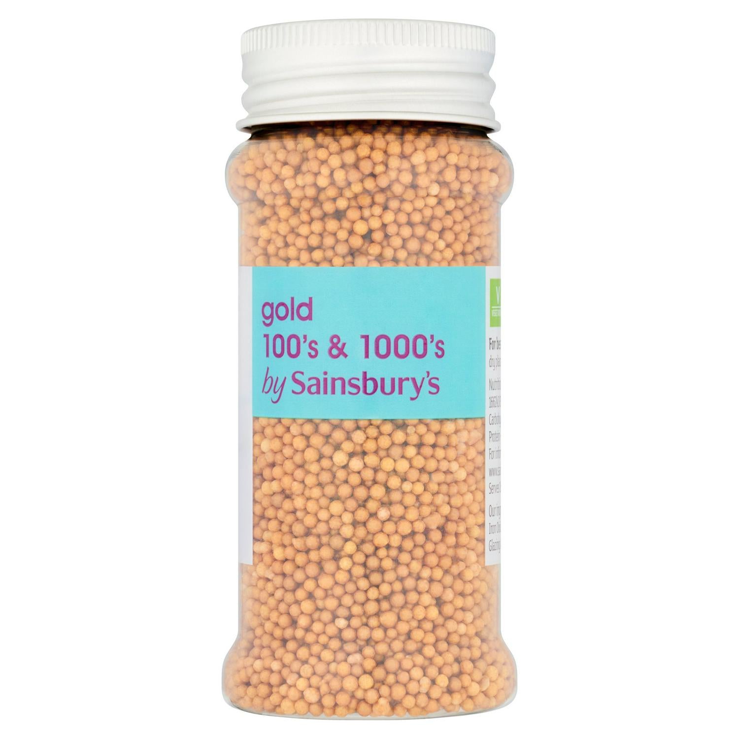 Sainsbury's Gold Hundreds & Thousands provide a classic, eye-catching finish for your baked creations. These gold sugar strands are packaged in a convenient jar for easy dispensing and storage. The product is confirmed as suitable for vegetarians, offering an accessible way to elevate your homemade cakes and biscuits.