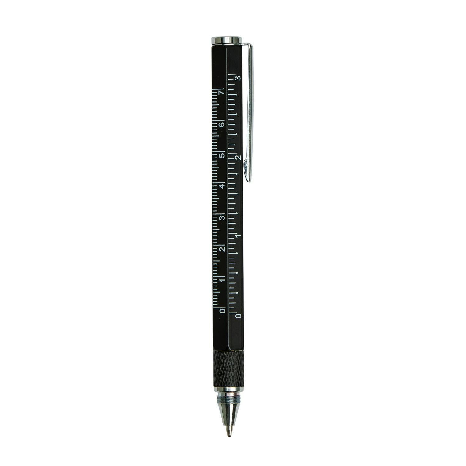 This clever two-in-one stationery item combines a functional writing tool with essential measuring capability. Crafted from durable metal, this pen features smooth black ink for clear writing and accurate mark-making. Keep this practical desk accessory handy for quick notes and on-the-spot measurements.