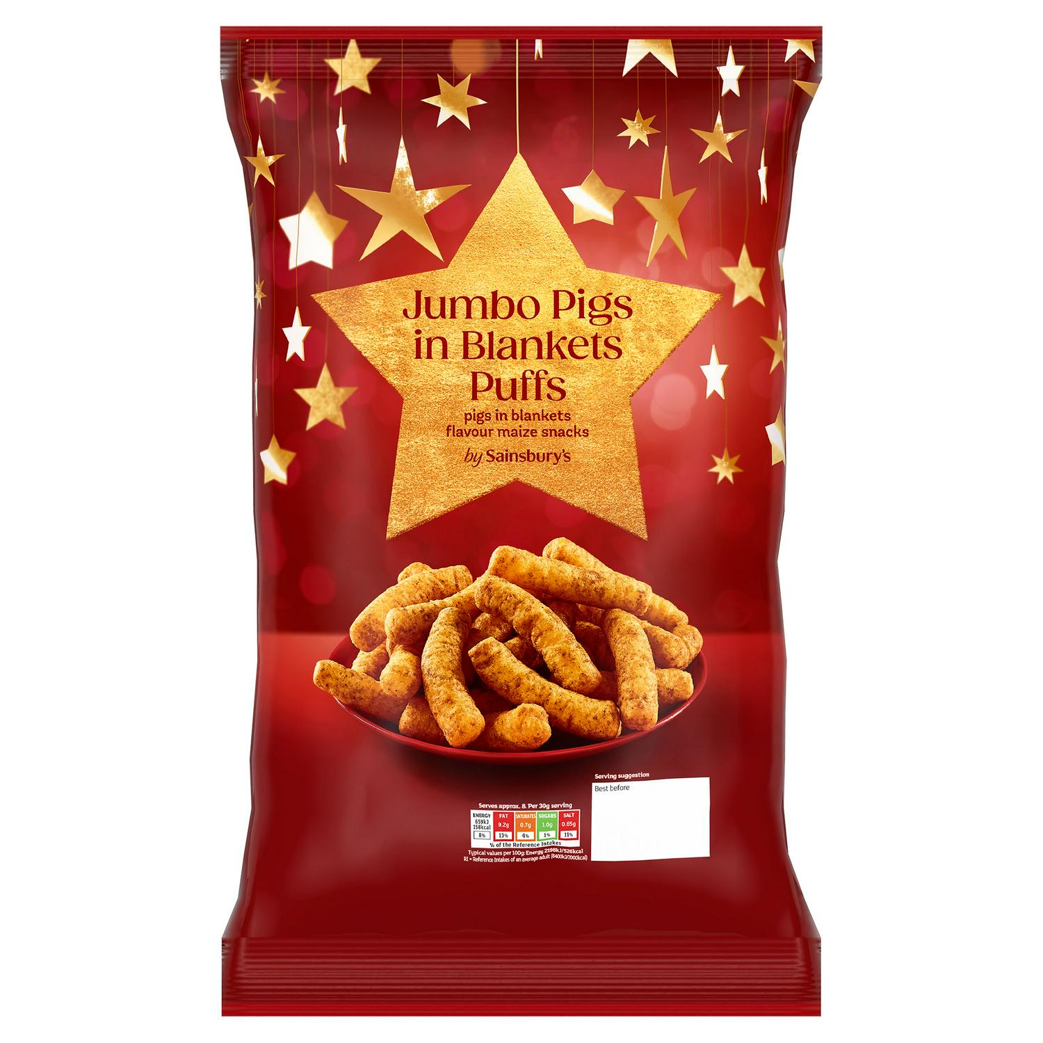 Sainsbury's Jumbo Pigs in Blankets Puffs offer a unique, savoury flavour experience in a light maize snack format. These jumbo-sized puffs capture the essence of the popular festive side dish. The packaging features a distinctive design suggesting this is a seasonal or celebratory treat.