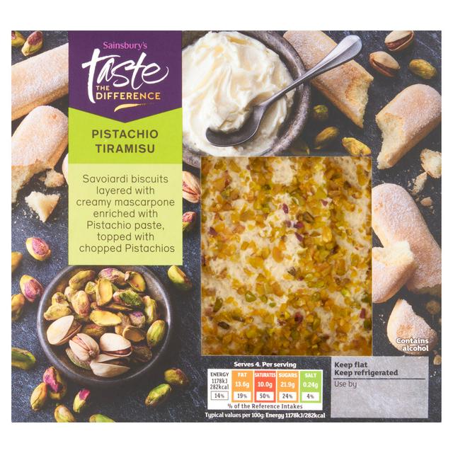 Indulge in the rich flavours of this Sainsbury's Taste The Difference Pistachio Tiramisu, designed for a premium chilled dessert experience. This 400g treat layers traditional Savoiardi biscuits with creamy mascarpone subtly enriched with pistachio paste.