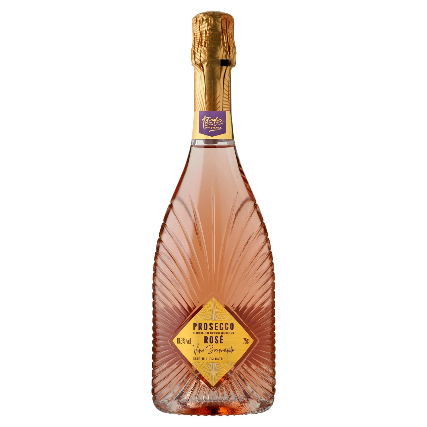 This Taste The Difference Prosecco Rosé Brut Millesimato offers a sophisticated experience in a standard 75cl bottle. This DOC-designated Italian sparkling wine is carefully crafted from grapes of a single harvest year. The Brut designation confirms a drier style, balanced by the inherent qualities of this Rosé selection. Note the elegant packaging, featuring a distinctive fluted bottle design and premium gold foil detailing. This wine carries an alcohol content of 10.5% vol for controlled enjoyment. Consider this high-quality selection for celebrations or as a refined aperitif. Discover true quality with this Italian rosé sparkling wine.