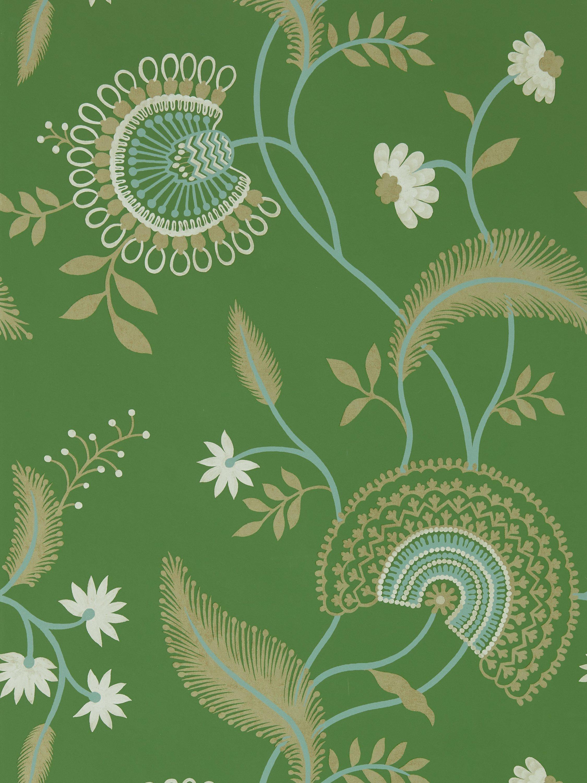 A rich wallpaper of stylised pods, flowers and leaves, this hand-painted Sanderson design has a lovely textural feel across its statement motifs.