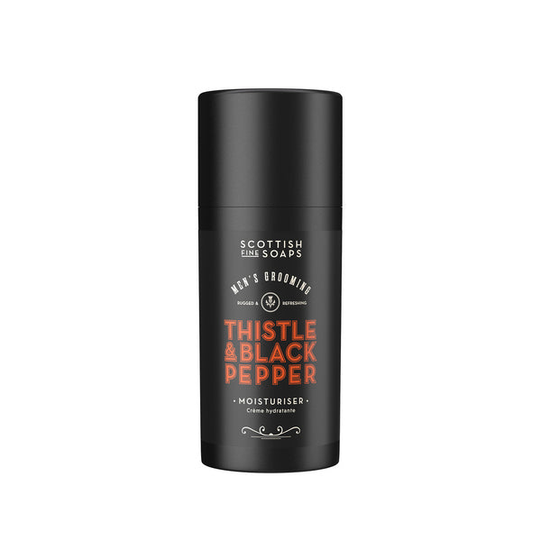 Men's Face Moisturiser 100ml Scent: Thistle & Black Pepper Lightweight formula Enriched with hyaluronic acid Suitable for Vegans Made in Scotland Keep your skin hydrated and protected with the Thistle & Black Pepper Moisturiser. Enriched with skin-firming hyaluronic acid and nourishing sweet almond oil, this lightweight formula provides daily hydration while improving skin texture. Infused with the bold, refined scent of Thistle & Black Pepper, it’s an essential addition to your grooming routine, leaving your skin soft, smooth and refreshed.