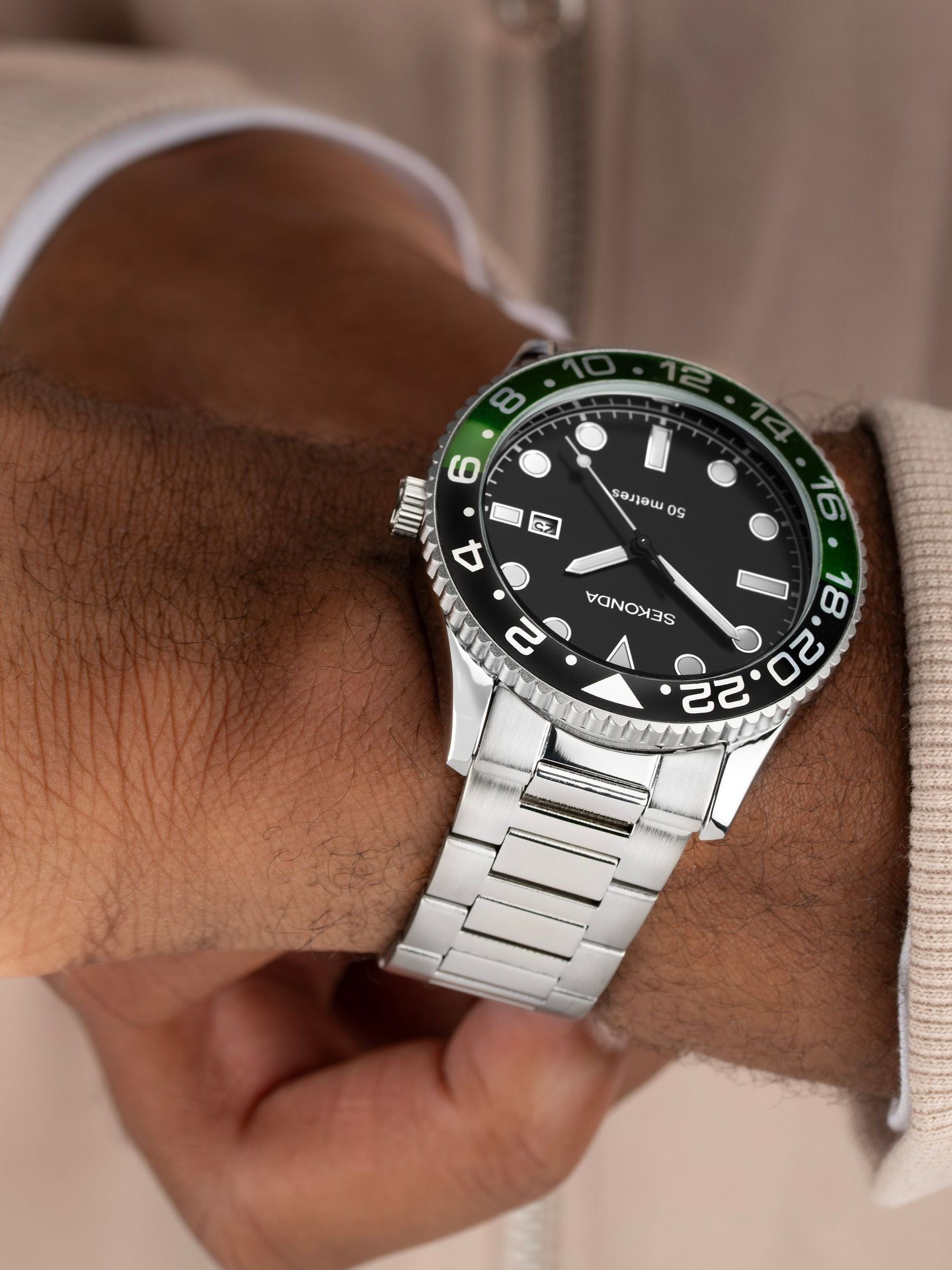 This watch fastens with a stainless steel bracelet. The watch has an ion-plated silver alloy case housing a black dial. Features include a black and green rotating bezel, a date window, luminous hands and hour markers and up to 50 metres water resistance.