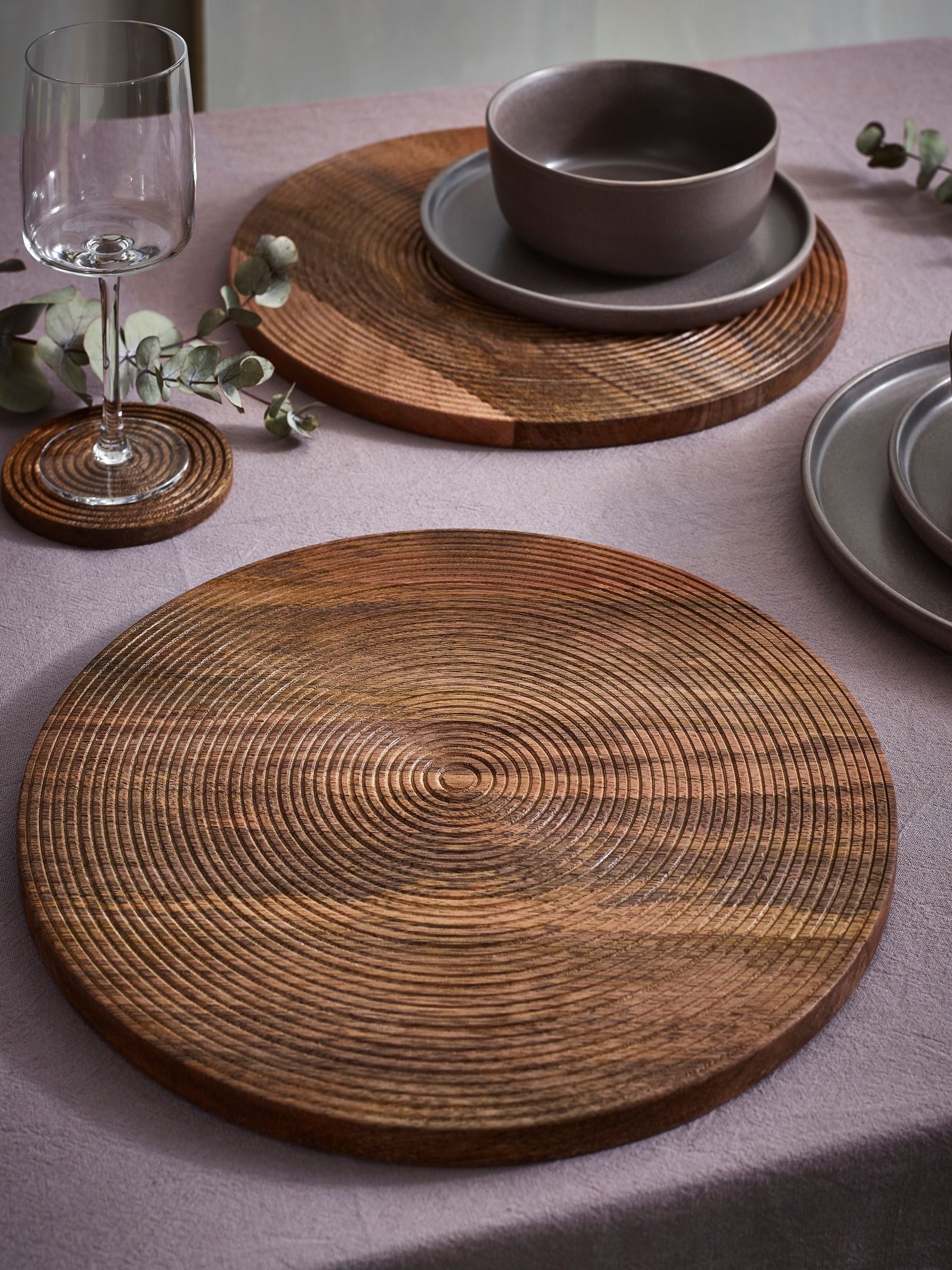 Crafted from mango wood, this set of 2 etched round placemats blend elegance with functionality.