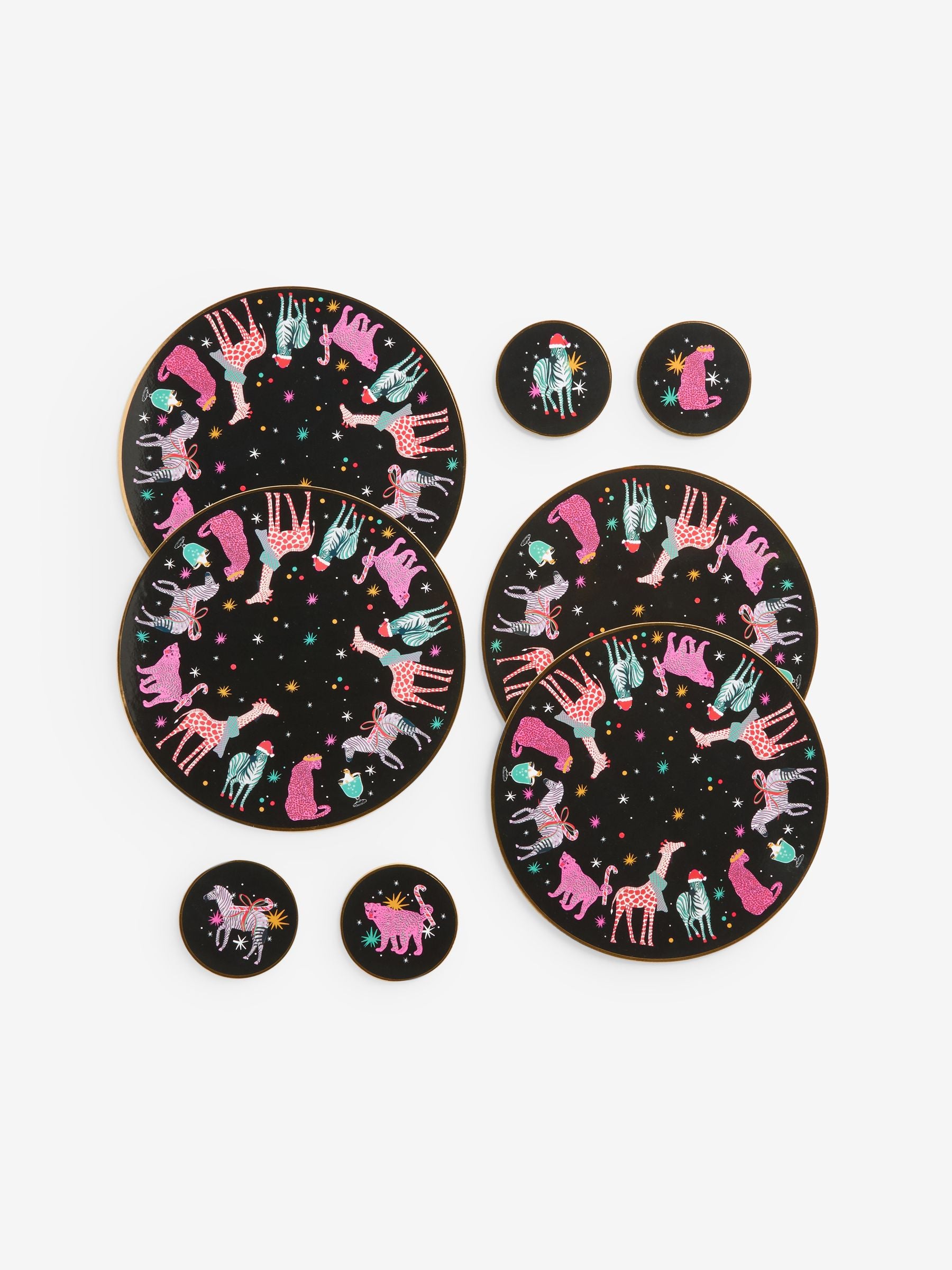 Get ready to party with this vibrant set of corkback placemats and matching coasters, each featuring a playful and colourful design of animals celebrating!