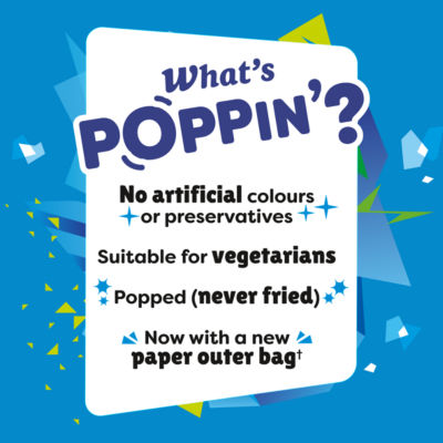 FeaturesPopped (never fried). 80 kcal per snack. Crispy Rice and Corn Snack. Made with Quality Ingredients. Suitable for vegetarians. No Artificial colours or preservatives.