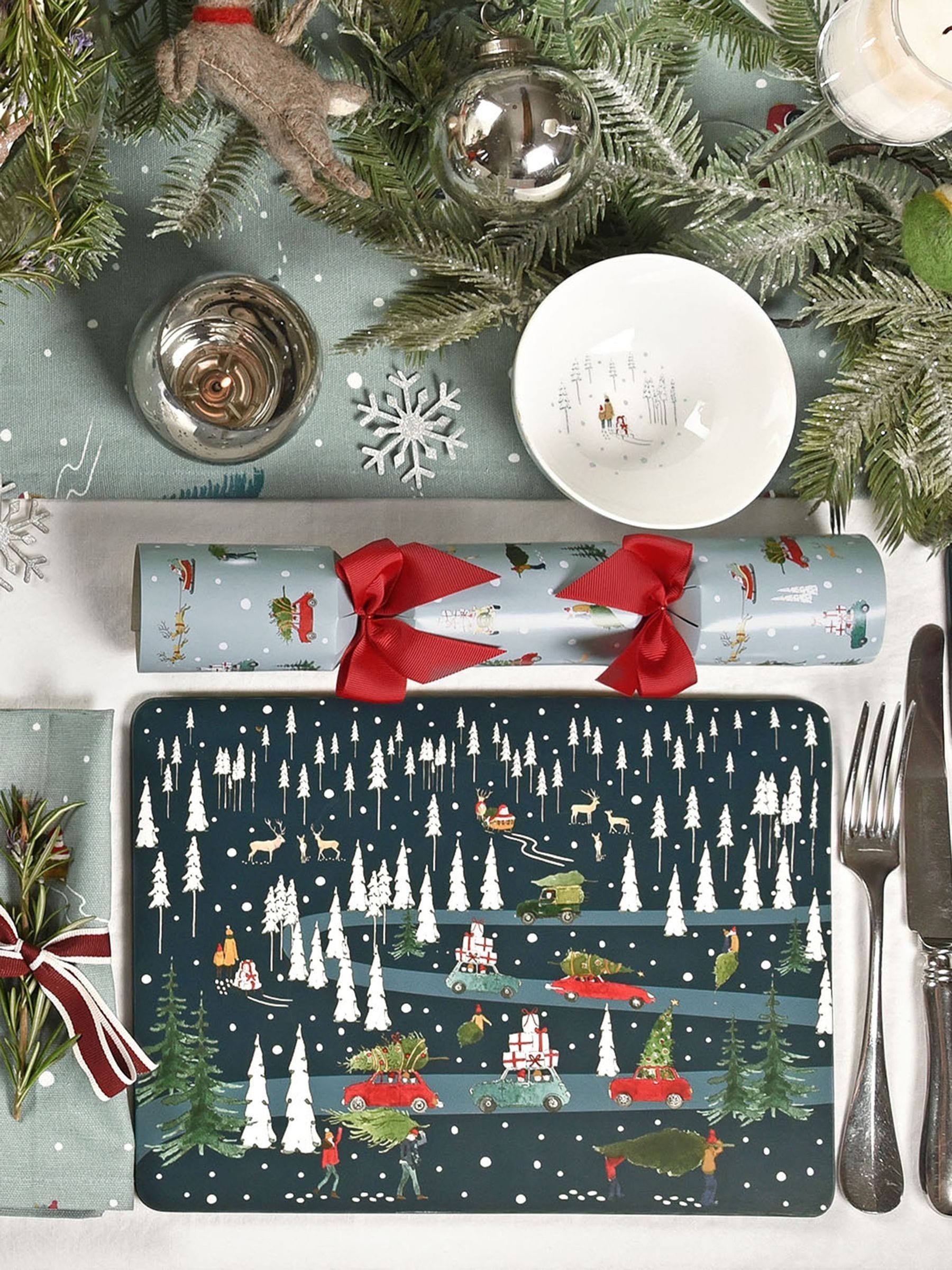 These heat-resistant placemats capture the excitement of the festive season, featuring snow-covered fir trees and a flurry of Christmas preparations set against a deep midnight blue background. Excellent for adding festive style to your Christmas table setting. Box of 4 H 21.5 x W 29 x D 0.5cm Slip-resistant cork backing Superior matt lacquered surface Matching coasters available Coordinating items available in the Home For Christmas Collection