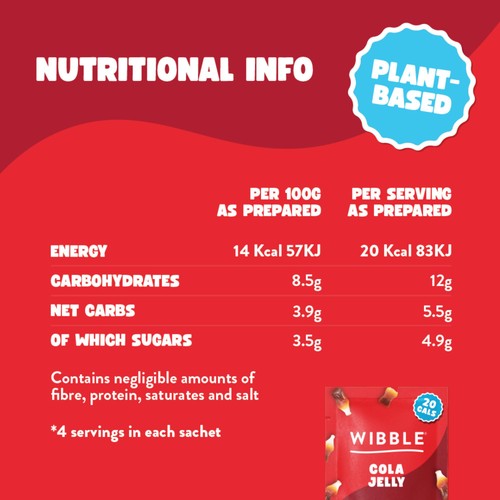 Read More20 Cals Per Serving Prepared. Its Jelly, all grown up, low in sugar, just add water, quick set, nothing artificial. Wibble Cola Jelly is plant-based and low in sugar. It's jelly, but not as you know it and tastes just like Cola gummy sweets. Unleash its natural and sweet Cola flavours and enjoy alone or even vodka shots!